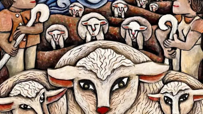 For the piece that was chosen to represent the exhibition, Shelley explained that it was a spontaneous carving. She didn’t plan it out fully and went along with what inspired her in the moment as she was creating it. This piece depicts a herd of sheep flanked by two shepherds with bluebirds filling the sky. She started out with one small part, the sheep on the bottom right, and added more as she kept working. One board is the main sheep in the front, the next board is the field and the shepherds, and the final board is the sky, creating a three-layer piece.